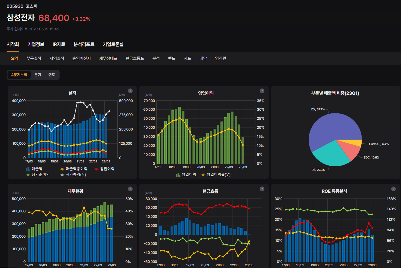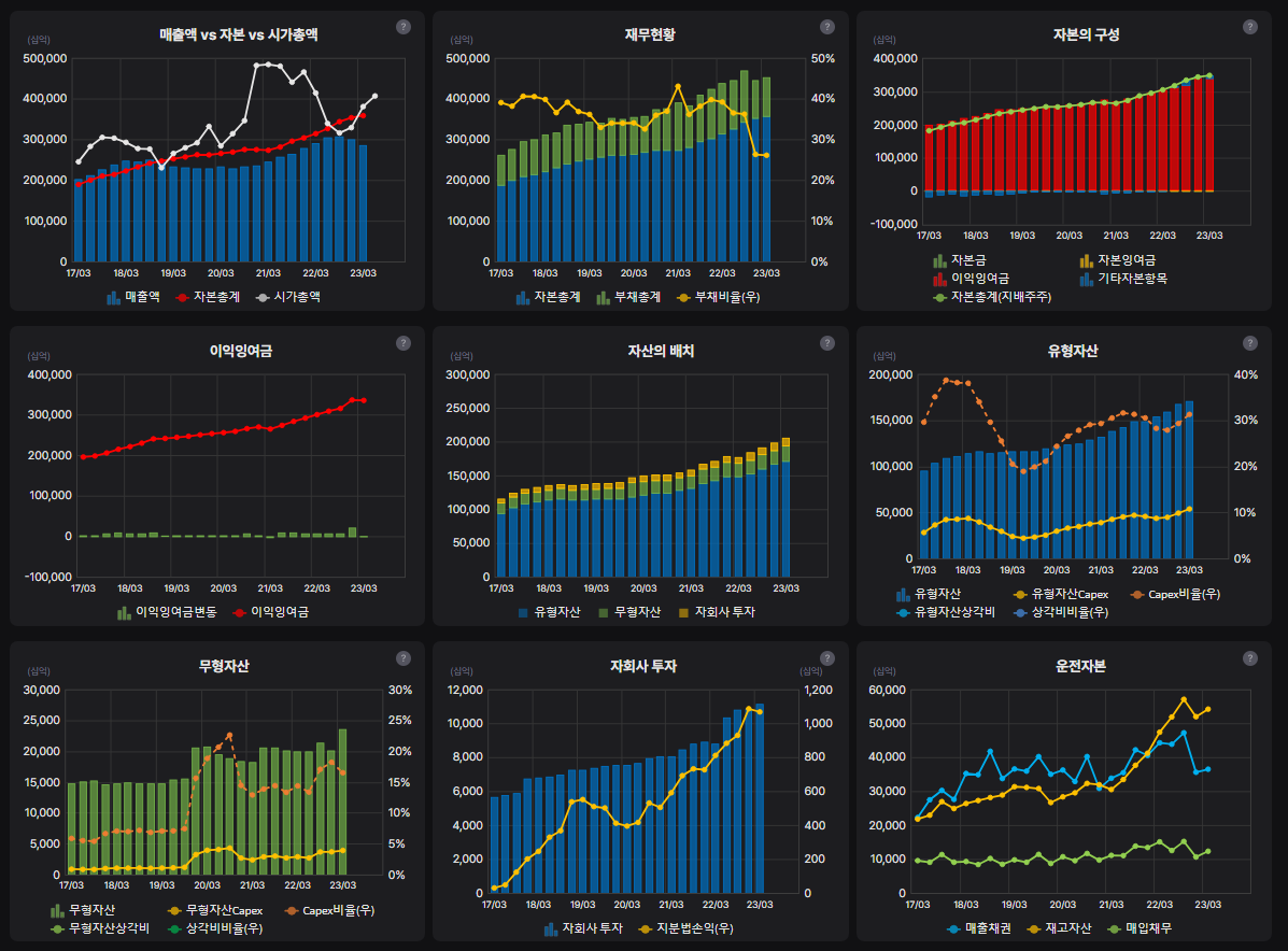 뿐만 아니라, 손익계산서와 재무상태표, 현금흐름표와 같은 재무제표 정보도 그래프로 시각화하여 제공합니다. 이를 통해 기업의 재무상태를 파악하고, 부채 구조, 자본 구성, 현금의 유동성 등을 간편하게 분석할 수 있습니다. 특히, 재무제표의 그래프로 나타낸 지표들은 시간 경과에 따른 동향을 파악할 수 있어 매우 유용합니다.
