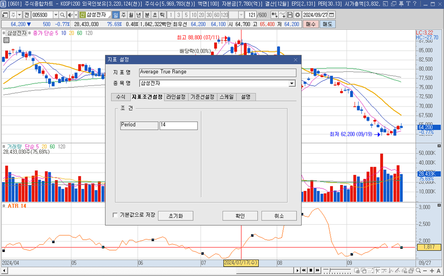 여기서 ATR 선을 더블클릭 하거나 보조지표 창의 왼쪽 위 ATR을 더블클릭하면 다음과 같이 기간 설정이 가능합니다.