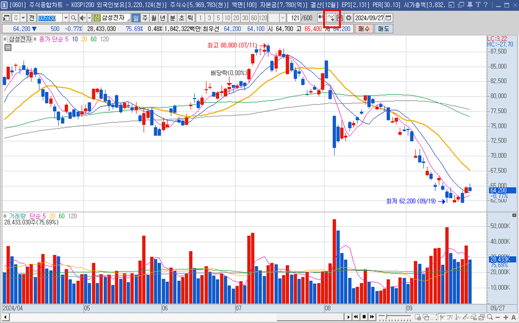1. 주식 차트에서 '지표 추가' 선택